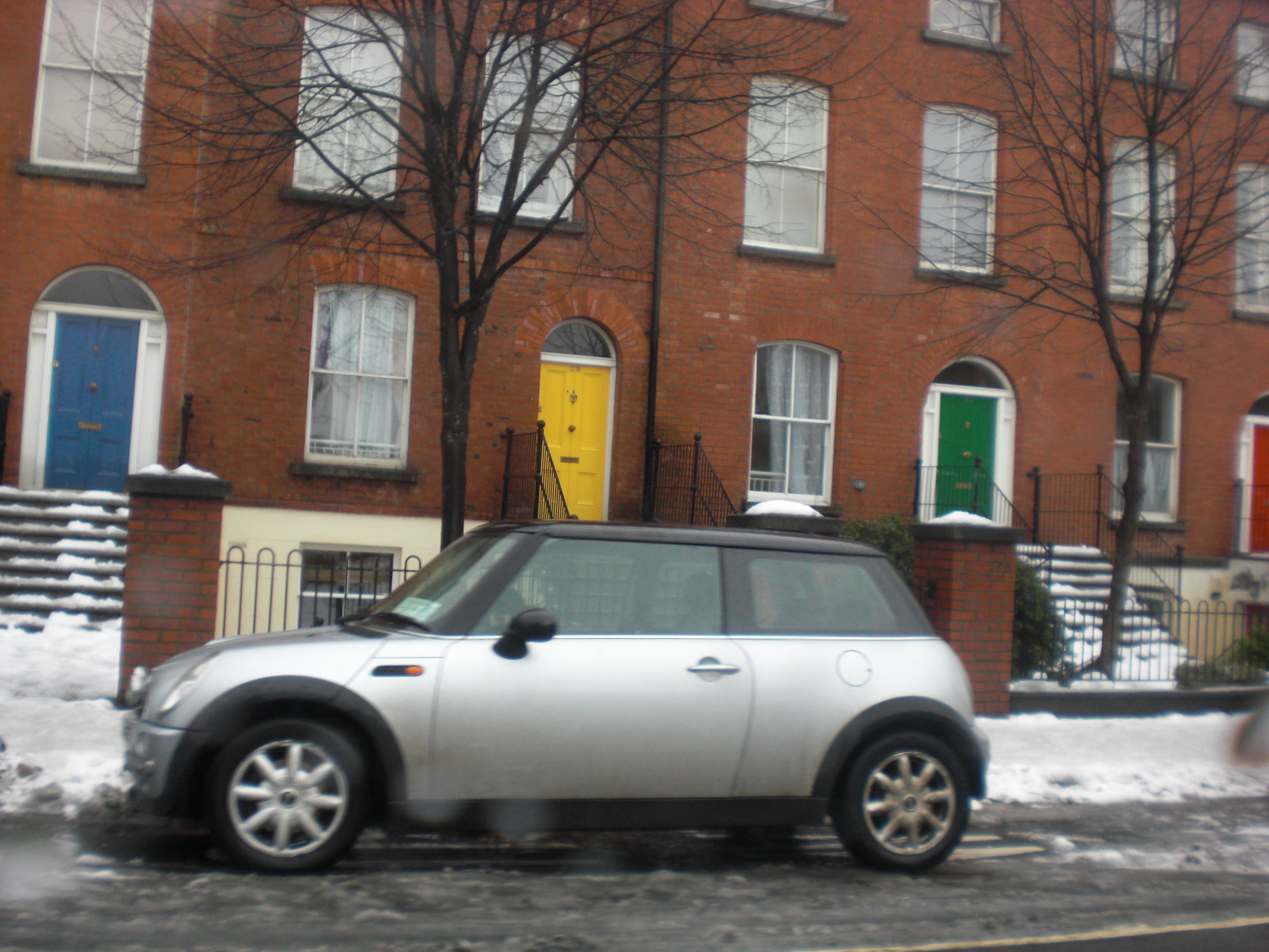 | Each of the doors is a different color...